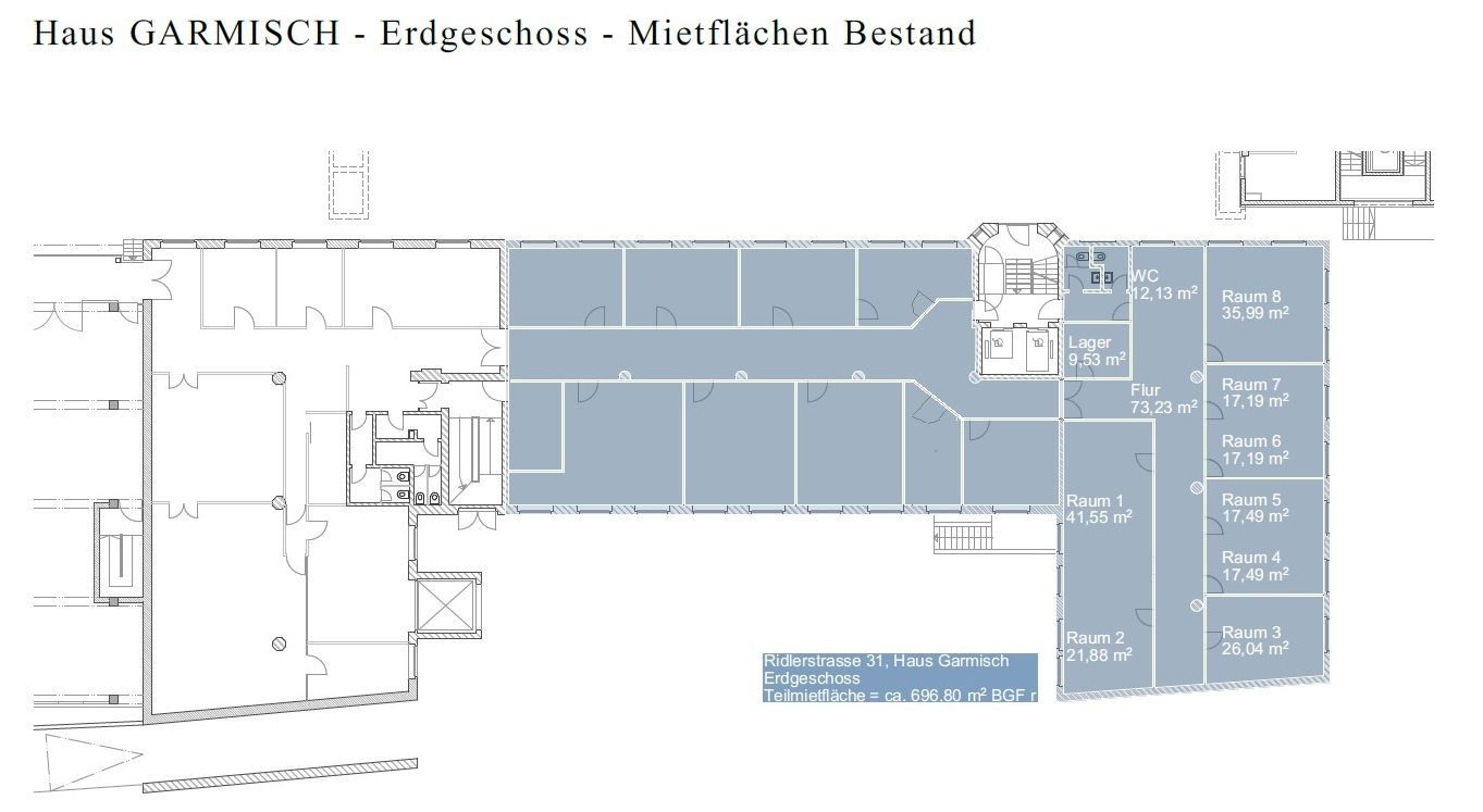 The building complex at Ridlerstrasse 31/3d has loft-style office space. An individual floor plan design or open plan areas are possible on request. On the site, there is also an underground garage with almost 100 parking spaces, as well as adequate storage and archive space. Lifts are available in all the buildings.